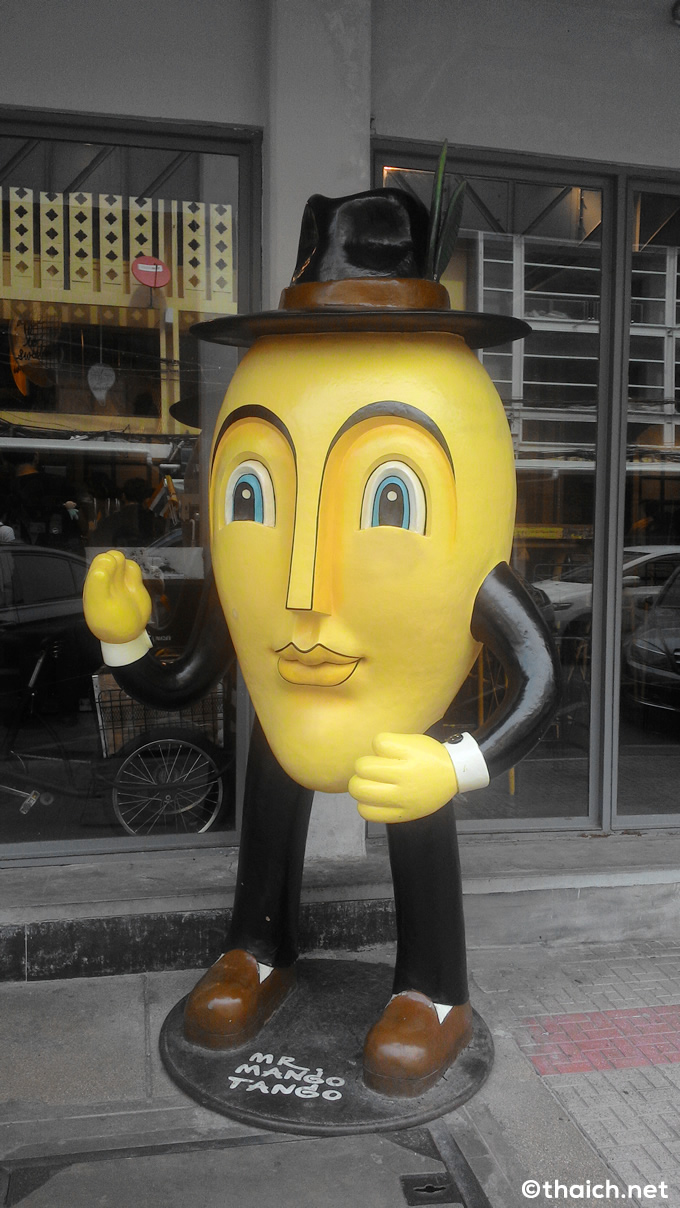 旅行者、特に女子がバンコクを訪れたら絶対に行ってみたいと言う定番中の定番のお店がマンゴースイーツ専門店の「Mango Tango」です。タイに何店舗かあるようですが、今回訪れたのが旅行者が最も行きやすいBTSサイアム駅からも近い、サイアムスクエア・ソイ3の店舗。目印は店頭のマンゴーおじさん人形”Mr.Mango Tango”です。