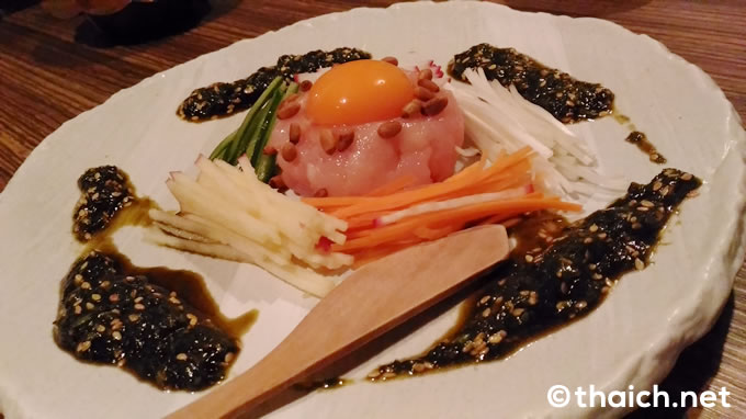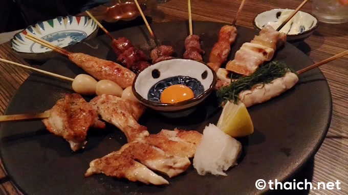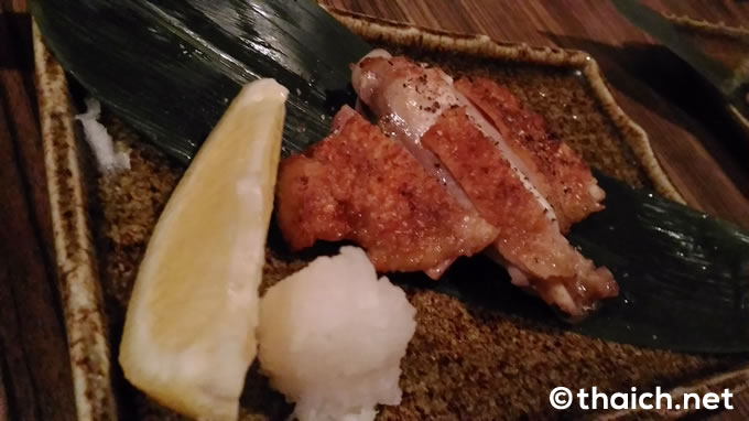 メニューは日本語と英語でしたが、タイ語メニューはないのでしょうか?「自家製つくね」が1本80バーツ、「ねぎま」が1本90バーつなど、焼きとりは一本100バーツ前後なのでそこそこ良い値段です。農場から地鶏を仕入れて串を打って炭火で焼き上げているそうです。