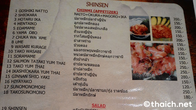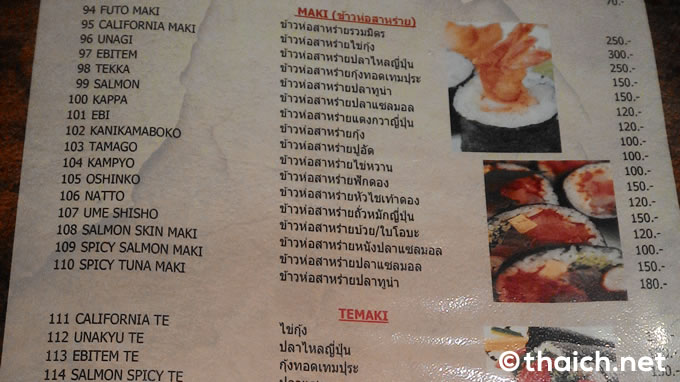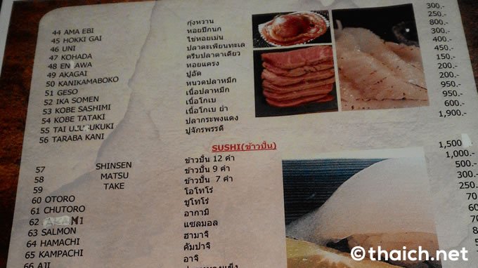 メニューは一品100バーツほどから。ちょっとしたオツマミやサラダから寿司や刺盛りなども。ざっとメニューを見てみましたが一番高いメニューは1900バーツのタラバガニでしょうか。ビールはアサヒスーパードライ、キリン一番搾り、ハイネケン、シンの小瓶が120バーツです。もしろん酒や焼酎やワリンもあります。