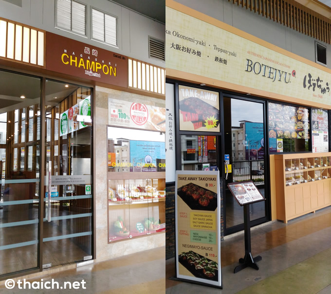 長崎ちゃんぽんの「リンガーハット」。店舗の名前より”CHAMPON(チャンポン)”が目立ちます。そしてお好み焼き・鉄板焼きの「ぼてぢゅう」。