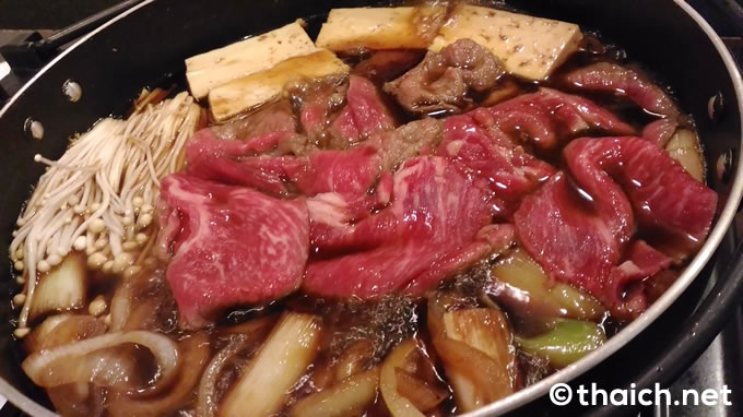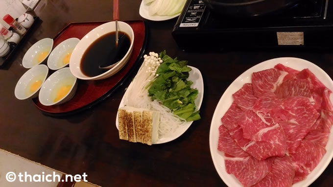 お酒を飲んで色々つまみながら待っていると、注文していた「むぎはん」の名物メニューがやって来ました。それが「牛肉すきやき」で、1人前500バーツ。Facebookページにも「すき焼き屋じゃないけれど、すき焼き好評です」と書いてあるとおり、人気のメニューなんですね。こちら4人前。生卵もついています。
