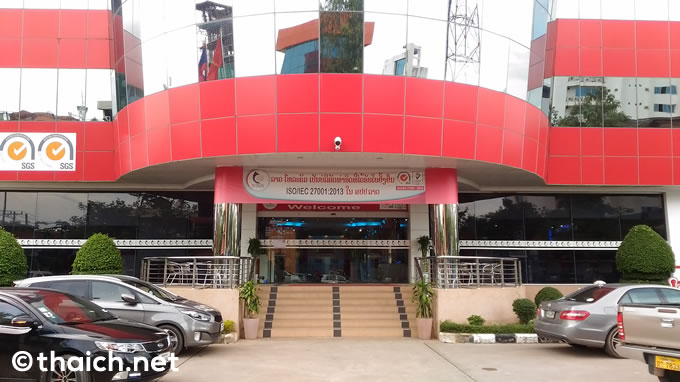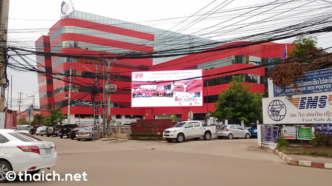 今回プリペイド(料金先払い)SIMカードを購入するために訪れたのは、ラオスの通信会社「ラオテレコム(Lao Telecom)」の本社。もちろんSIMカードは市内の商店などでも購入可能ですが、定価でSIMカードを購入したかったのと、どんなプランがあるのか知りたかったので、本社窓口まで足を伸ばしました。ビエンチャンで旅行者が集まる地区、例えばナンプ広場からであれば徒歩10分ほどです。とっても目立つ真っ赤な建物が「ラオテレコム(Lao Telecom)」本社。