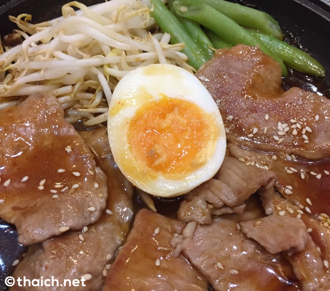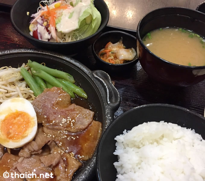 オーダーしたのは「豚焼肉」。単品だと129バーツ。ご飯、みそ汁、サラダ、キムチが付いたセットになると149バーツです。セットが断然オトクな感じです。