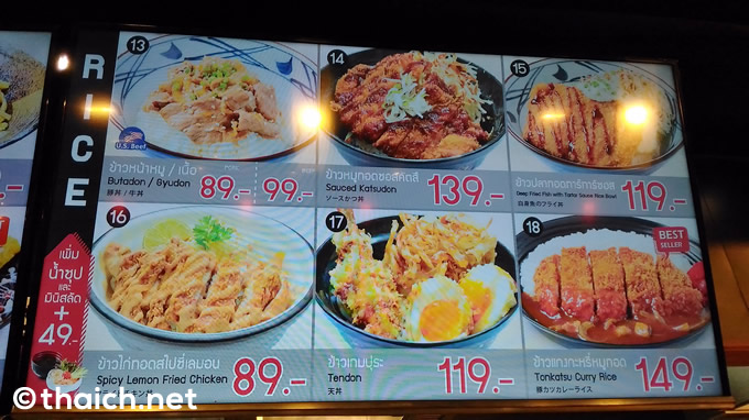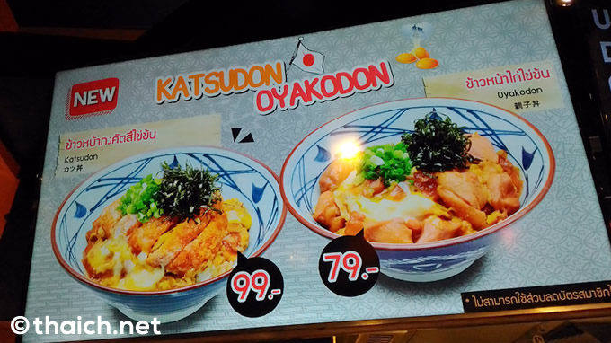 タイの「丸亀製麺」と日本の「丸亀製麺」との違いは、タイがご飯メニューも充実しているところ。「豚丼/牛丼」、「天丼」、「ソースかつ丼」、「豚カツカレーライス」など。