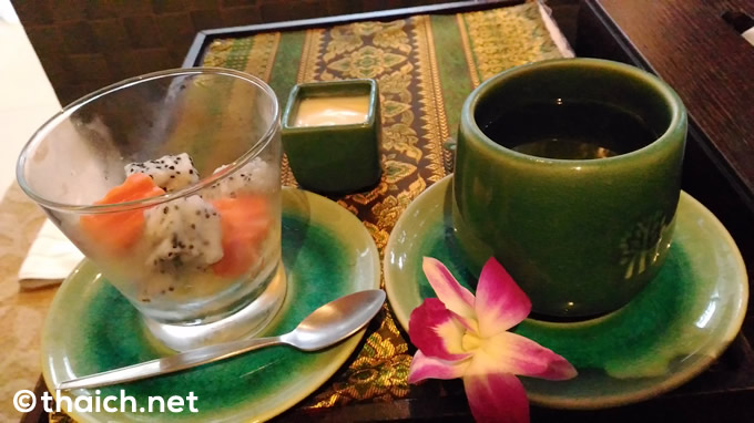 施術の終わりにはお茶とヨーグルトフルーツサラダをいただいて終了。癒された体に染み渡ります。