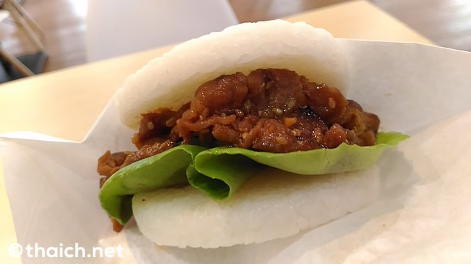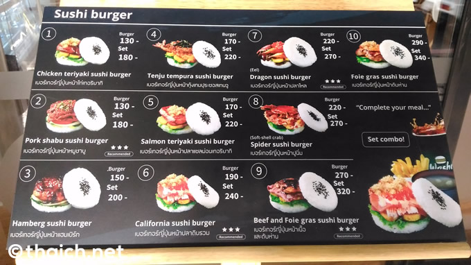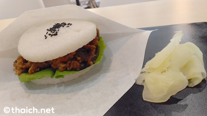 注文したのは定番メニューの一つである「ポークしゃぶ寿司バーガー(Pork shabu sushi burger)」(130バーツ)とお水(20バーツ)。寿司バーガーはプラス50バーツでセットに出来るようです。セットにするとみそ汁とフレイドポテトとドリンク付き。