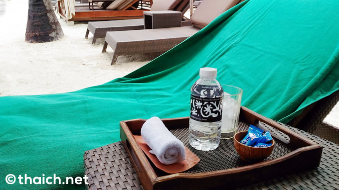 ビーチチェアーに座ると、何も言わなくてもすぐにスタッフさんがバスタオルと、冷たい水、おしぼり、キャンディーを運んできてくれます。