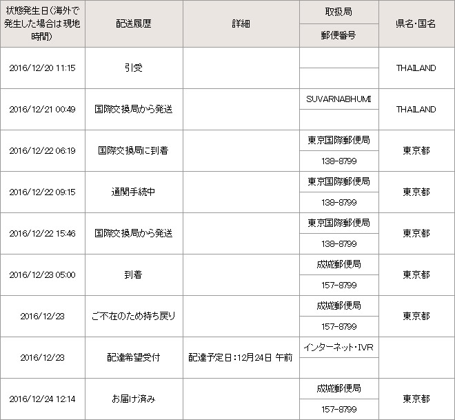 今回バンコクで発送してから東京都の送付先に到着するまで5日。実際は4日目が不在だったので4日で到着ということになります。以前は3日で到着したこともあったと記憶しているので、タイミングによっても前後するのでしょう。