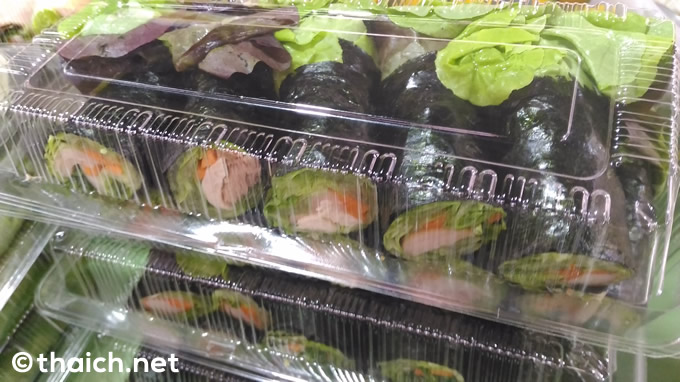 ラムカムヘン通りにある土曜市場を訪れると、沢山の屋台が並ぶ中で生春巻きの屋台を発見。そこでちょっと珍しいものを見つけました。それがサラダの海苔巻き。生春巻きのライスペーパーの代わりに、海苔が使われています。言うなれば「海苔春巻き」でしょうか。見た目のお寿司っぽさに惹かれて、買ってみました。