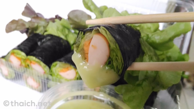 1パックは60バーツ。この屋台には生春巻きや海苔春巻きにつけるドレッシングも色々な種類があって、和風っぽくワサビ味を選択しました。