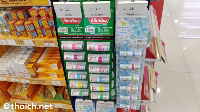 こちらが「ヤードム」。いわゆる嗅ぎ薬で、スースーするメンソールの香り。タイでは普段使いの他にも、酔い止めなどにも利用されるお馴染みのもの。一個20バーツとやすいので、皆んなに配るお土産にぴったりです。