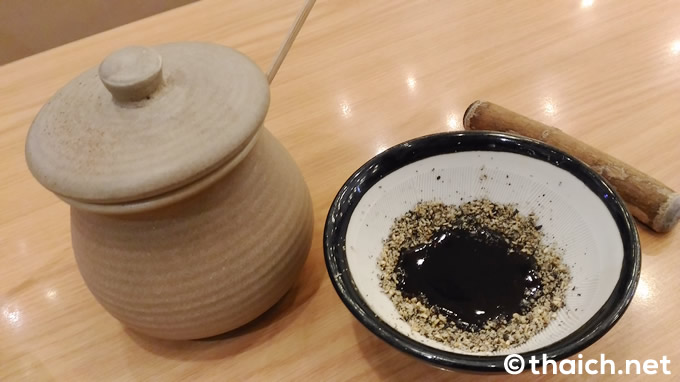 タイ人の店員さんに食べ方を聞いてみると、すり鉢にソースを入れて胡麻を混ぜるのが正しい食べ方のようです。