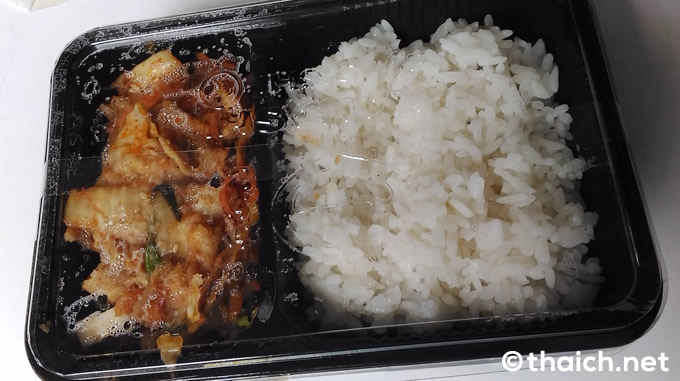 価格はどれも100バーツ前後で格安。「豚キムチ丼」(89バーツを)持ち帰りでオーダー。