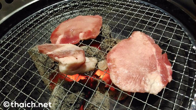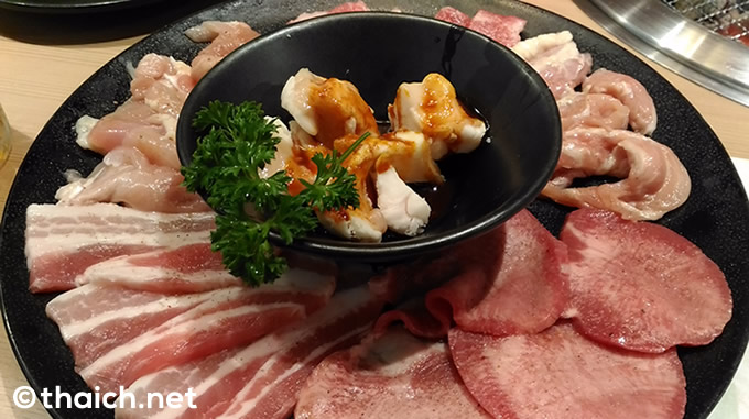 とりあえず、ご飯とサラダとスープ、カルビ、牛ホルモン、鶏せせり、タン、黒豚、若鶏が大皿に盛られた「バラエティ満腹定食」(450バーツ)をオーダーし・・・