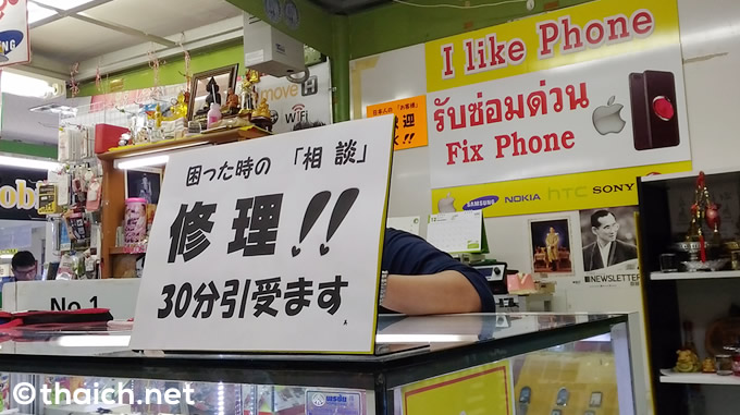 MBKセンター4階 ZONE Aにある「I Like Phone」は、なんと日本語対応。「困ったときの『相談』 修理!!30分引受ます」「なんでも『相談』 日本語OK!!」「日本人の『お客様』大歓迎 OK!!」と表示されています。実際店頭に立つTOKさんは日本語ペラペラ。早速iPhone6のSIMロック解除について相談してみました。