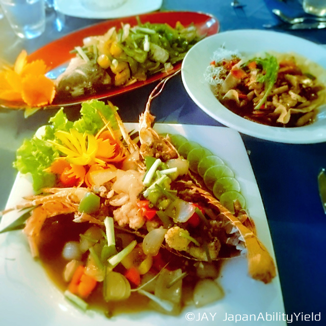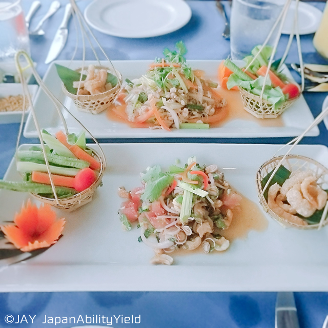 そして食事は、マネージャーのSakさんがオススメのタイ風のサラダを2種類注文しました。一つはひき肉のサラダ、もう一つはマグロのサラダです。