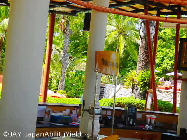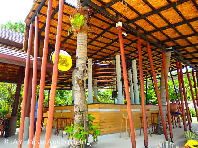 まずはビーチバーから。こちらにはカウンター席とテーブル席があります。水着のままでも大丈夫ですので、海やプールで遊び疲れた体をクールダウンするには最適の場所です。