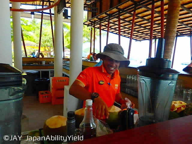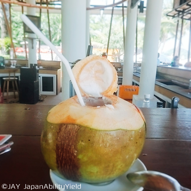 ここでは笑顔が素敵な男性スタッフさんにココナッツジュースをお出ししてもらいました。スプーンも一緒に付いてくるので、内側の白い身の部分をすくって頂くのも最高に美味です。