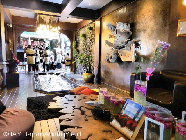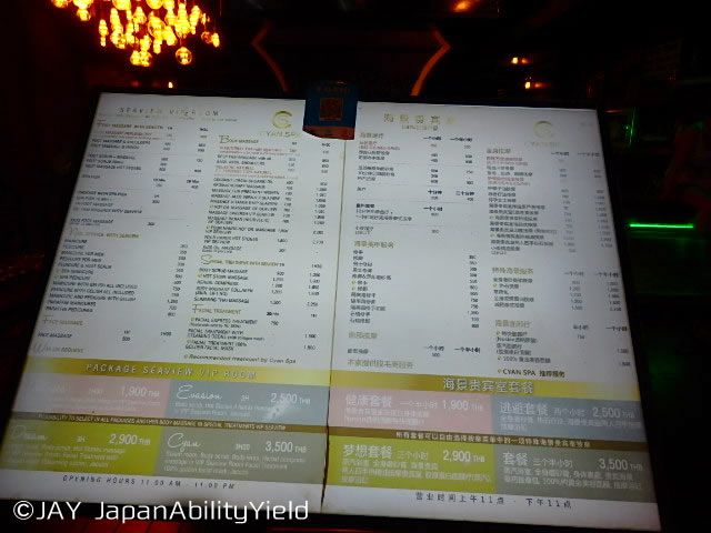 そして、フィッシャーマンズビレッジには所狭しとマッサージ店が軒を連ねていますが、価格表を見てみるとフットマッサージの相場は1時間300バーツのようです。その中で一際目を引く店構えの「CYAN.SPA」。かなり強気な価格設定になっておりました!