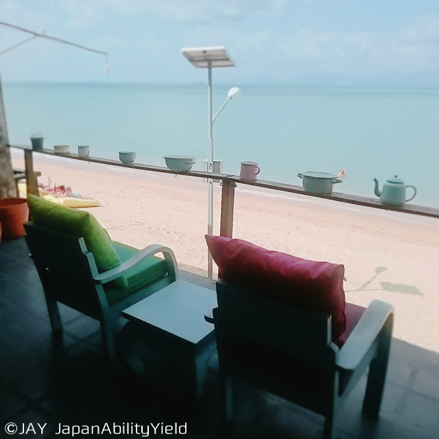 店員さんによると、すべての席がオーシャンビューになっているとのことと、表示価格から10%オフにしてくれるというので入ってみることに。席に通されるとなんとも気持ちの良い眺め。
