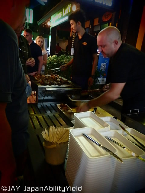 人気のステーキハウス店の前では、オーストラリア人の店主自ら自慢の骨付きOGビーフを焼いて売っていました。一皿100バーツ。