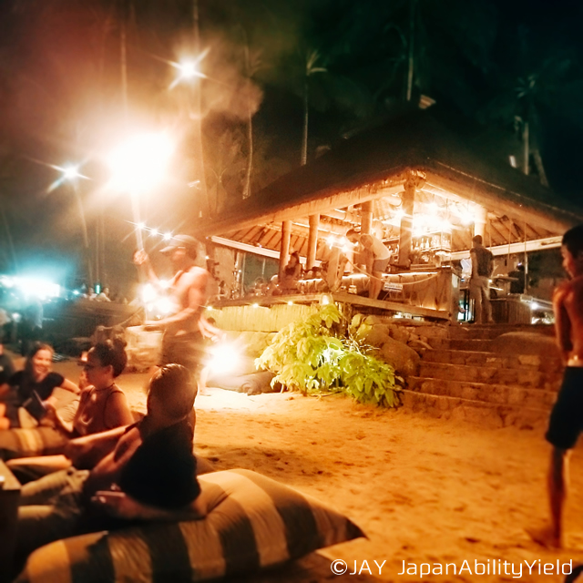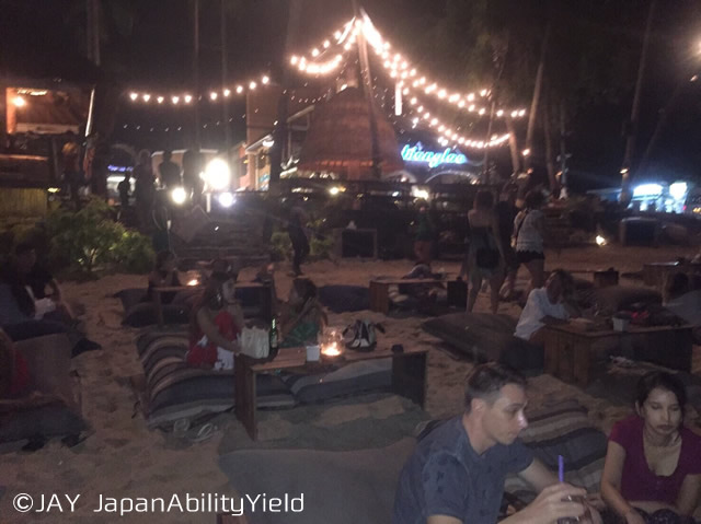 バーカウンターの椅子がブランコになっており、客席はビーチ上に置かれた木のテーブルと、またまた大きなビーズクッションが用意され、大きなスクリーンもあり、皆さん思い思いの格好で過ごされています。