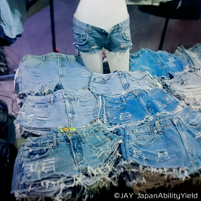 デニムのホットパンツは一つ200バーツ(約600円)です!サイズも豊富で、店員さんがサイズを測ってくれて自分に合う物を探してくれます。リゾート地なら生足で挑戦してみてもイイかもしれません。