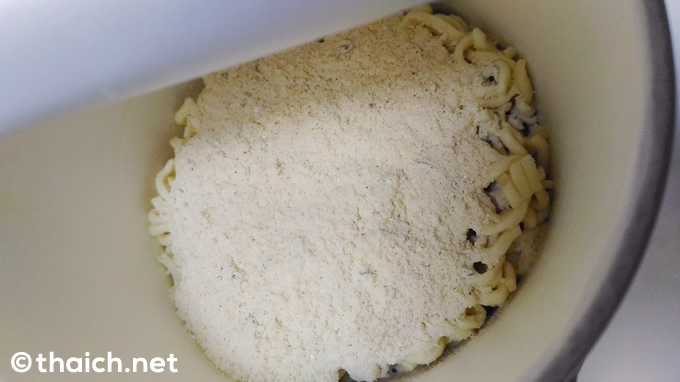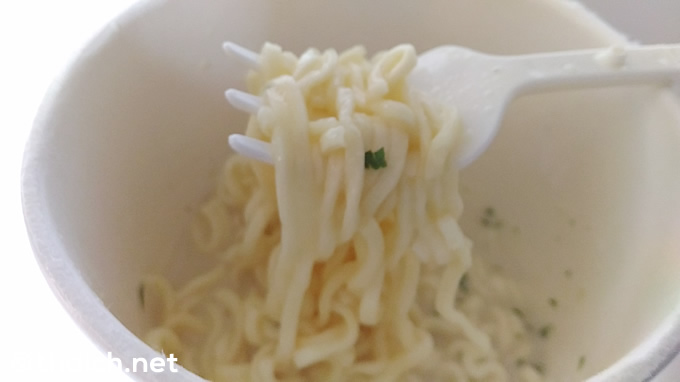 お湯を入れて4分待って出来上がり。普通のカップ麺よりお湯の量は少なめのようですね。具は少々のネギ。