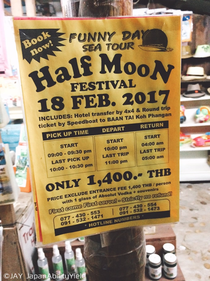サムイ島からは「ハーフムーンフェスティバル」向けにツアーも準備されています。こちらは交通費込で1,400バーツなので、だいぶお得にパーティーを楽しめそうです。