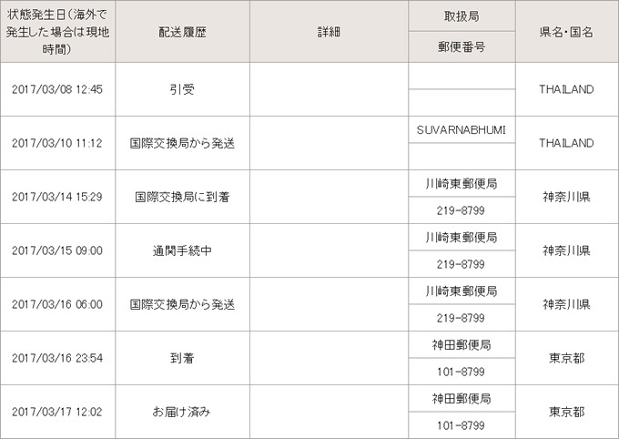 「ところでレジスターって日本語ではなんという郵便なんだろう?」と思いつつ、追跡サービスでレシートに記載された””RR””で始まり””TH””で終わる13桁のお問い合わせ番号を入力すると、日本語で国際書留と記載されていました。レジスターとは国際書留のことなんですね。