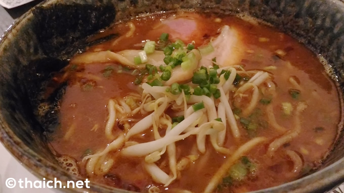 「福田製麺」のお勧めであろうメニューは「魚介とんこつ焦がしネギ油」「濃厚とんこつ」「特選みそ」の3つ。この日は「特選みそ」(230バーツ)をオーダー。