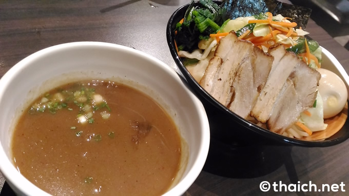 待つこと数分。お待ちかねの「つけ麺」(220バーツ)が運ばれて来ました。野菜とチャーシュー、煮玉子が乗った麺と、スープ。他にも湯呑みに入ったスープも付いてきました。湯呑みのスープはつけ麺スープに割る用でなく、普通に口直しに飲む用だそうです。あっさりした醤油スープですね。