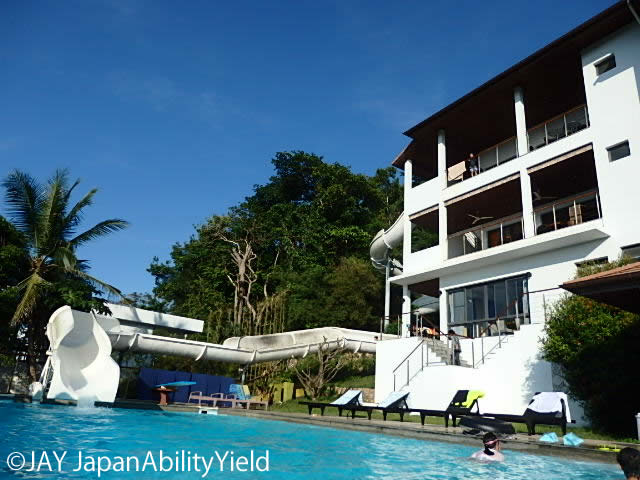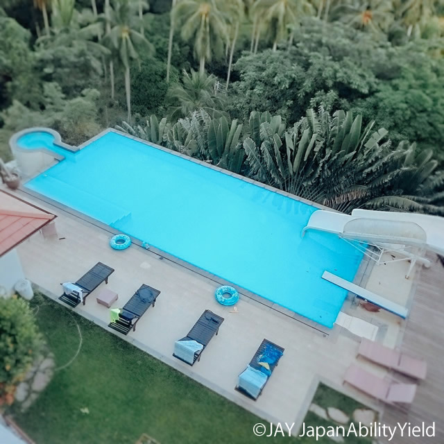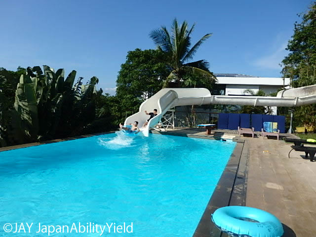 なんといっても一番の特徴は、92㎡の大きなインフィニティプールと、3階のバルコニーから聳える、長さ78mのウォータースライダーです。1棟まるまる借りられるヴィラですから、宿泊しているのは私たちだけ。もちろんこの広いプールもウォータースライダーもすべて貸切です!!!