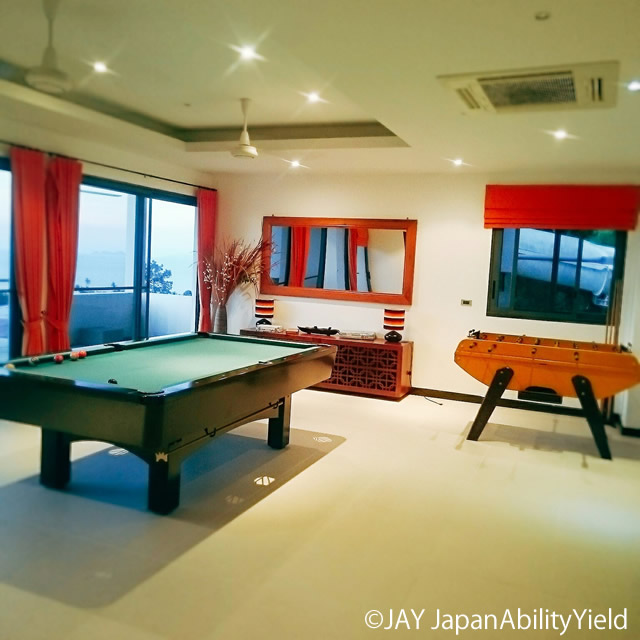 2階にはビリヤードとフースバルというサッカー盤のようなゲームがあるので、日中はプール、夜は2階でゲームをしながらワイワイ過ごすなんてことも可能です。