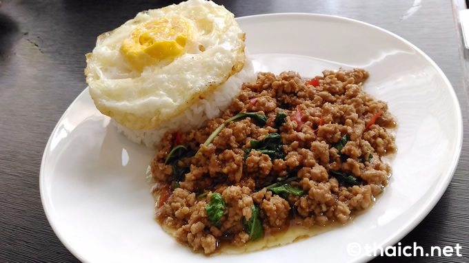 そんな「サリカ」でオーダーしたのは190バーツの豚ひき肉のガパオライス。これに目玉焼きを乗せてもらいました。友人によると、「ここのガパオは絶品で毎回注文する」のだそうです。