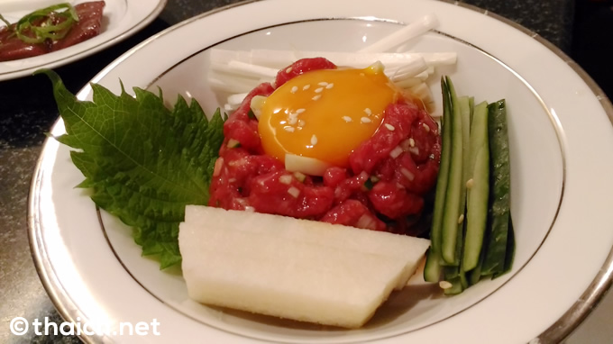 日本では規制により生肉を食べる機会は減りましたが、バンコクではまだまだあります。「ユッケ」は280バーツ。なお公式ウェブサイトによると、「銀座堂」で提供されているタイ産和牛は”ホルモン剤も化学肥料等も不使用契約農家で大切に飼育されたナチュラルヘルシー和牛です。産地から冷凍されずにチルド状態で運送されるため極上のお肉をお召し上がり頂けます。”とのことです。