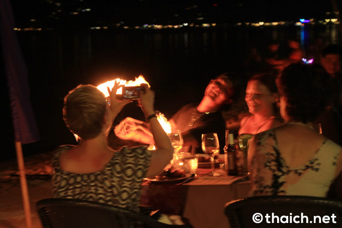 大歓声で終了したファイヤーショー。最後はパフォーマーがテーブルを回って記念撮影の時間です。