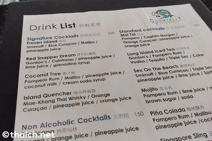 こちらはビーチの前のプールの横にあるバーのドリンクリストです。ノンアルコールのカクテルもあるので、お酒が苦手な方も大丈夫。