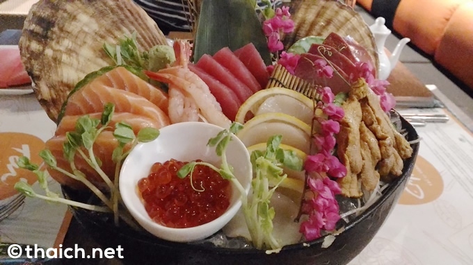 まず出てきたの「オーシャン盛り合わせ(OCEAN MORI AWASE)」(1,420バーツ)。サーモン、マグロ、甘海老、ハマチ、ホタテ、イクラ、そしてウニと、新鮮で美味しそうなお刺身7種が色鮮やかで実に美しいです!しかもハマチとホタテとイクラは日本産!