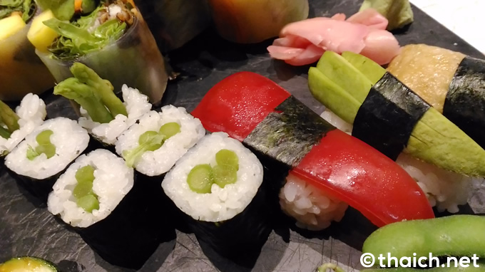 握り寿司はパプリカとアボガドと油揚げ。海苔巻きはアスパラ。特にこのアスパラの海苔巻きが以外に美味しく、もっともっと食べたかった(笑)