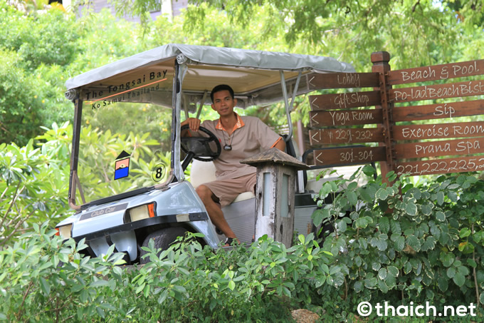広大な敷地を有する「ザ・トンサイベイ」では、24時間利用可能(電話で呼び出し)なバギーは欠かせません。チェックイン後はもちろんバギーに乗って部屋へと向かいます。自然保護に力を入れる「ザ・トンサイベイ」は部屋までの道も生い茂る木々でいっぱいで、さながらジャングルクルーズの様です!
