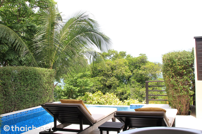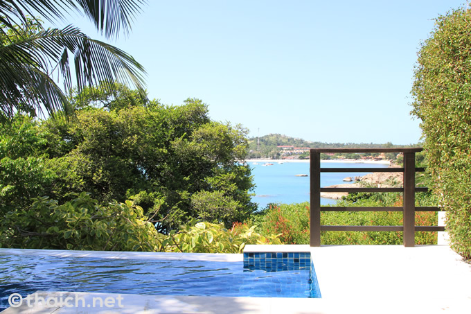 サムイ島「ザ・トンサイベイ」のプールコテージから見る青い海と生い茂る木々
