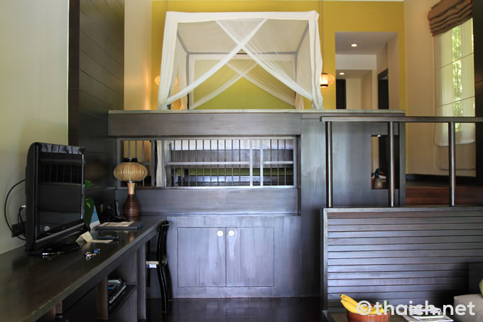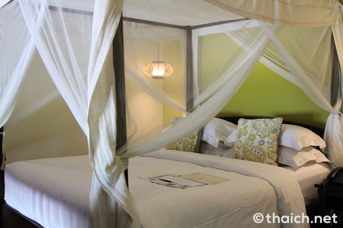 大きなキングサイズのベッドには、万が一部屋の中に蚊が入ってきても安心して眠ることが出来るように、蚊帳が備え付けられています。