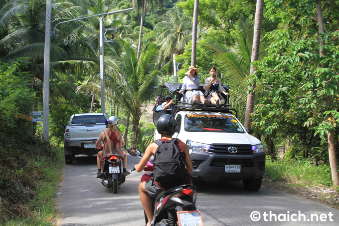 この辺りには象乗り体験が出来るエレファントキャンプや、観光客でも銃が撃てる射撃場、山の中を滑る一人用のぶら下がりロープウェイなどアトラクションの多い地域。島内を巡るツアーでも訪れることが多いようで、自動車の屋根にシートを付けたツアー車も走っていました!