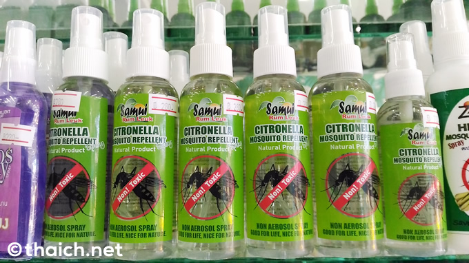 サムイ島で生産されている蚊よけスプレーは、人体には無害なシトロネラというハーブのエキスで作られたもので、お子さんでも安心して利用可能。薬局に行くと、色々な種類のシトロネラ蚊よけスプレーが並んでいます。