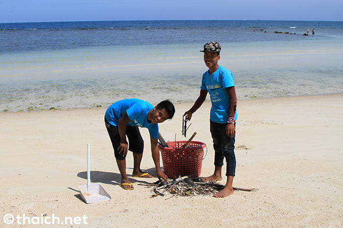 ビーチを掃除するホテルのスタッフさんと