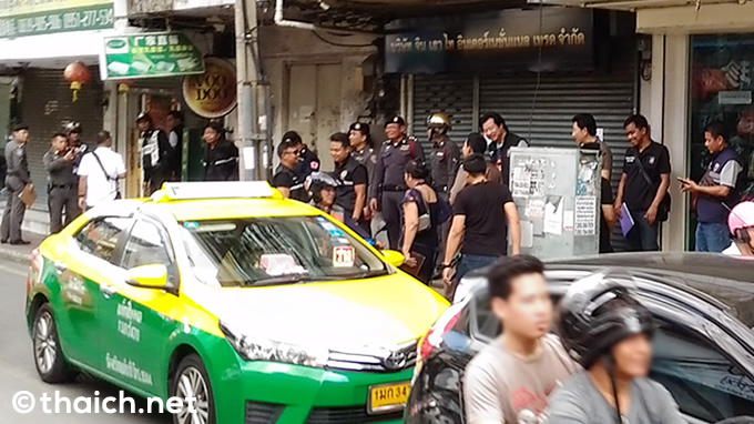 そんなプラチャーラートバンペン通りを通ると、警察官が大集結中。あちこちの店の中にも警察官がいて、報道カメラマンの姿も。