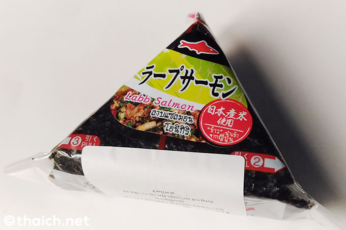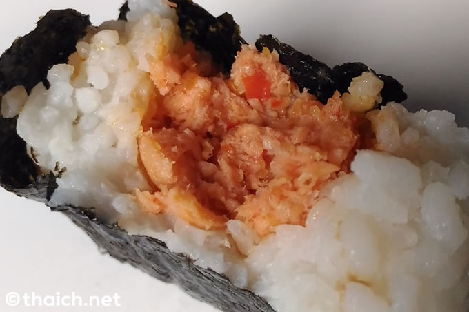「ラープサーモンおにぎり」を半分に割ってみるとご覧の通り具はたっぷり。見た目はラープという感じはあまりしないですね。味の方もラープという感じはそれほど無く、普通に日本料理のおにぎりとして美味しく食べることができました。