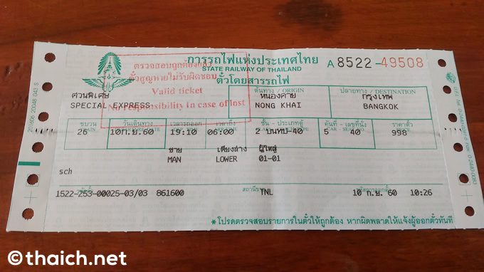 ラオスの首都ビエンチャンから国際列車で、タイのノーンカーイ駅へ到着したのが17時45分。(参照 鉄道でラオスからタイへ国境越え!ターナレーン駅発ノーンカーイ駅行き) その後、19時10分発の列車でバンコク・ホアランポーン駅へ向かいます!チケット価格は2等寝台下段で998バーツでした。