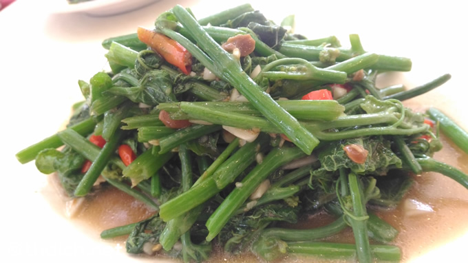 「チャヨテのオイスターソース炒め」(小120バーツ)。タイではファクメオと呼ばれるハヤトウリの葉と茎を炒めたものです。